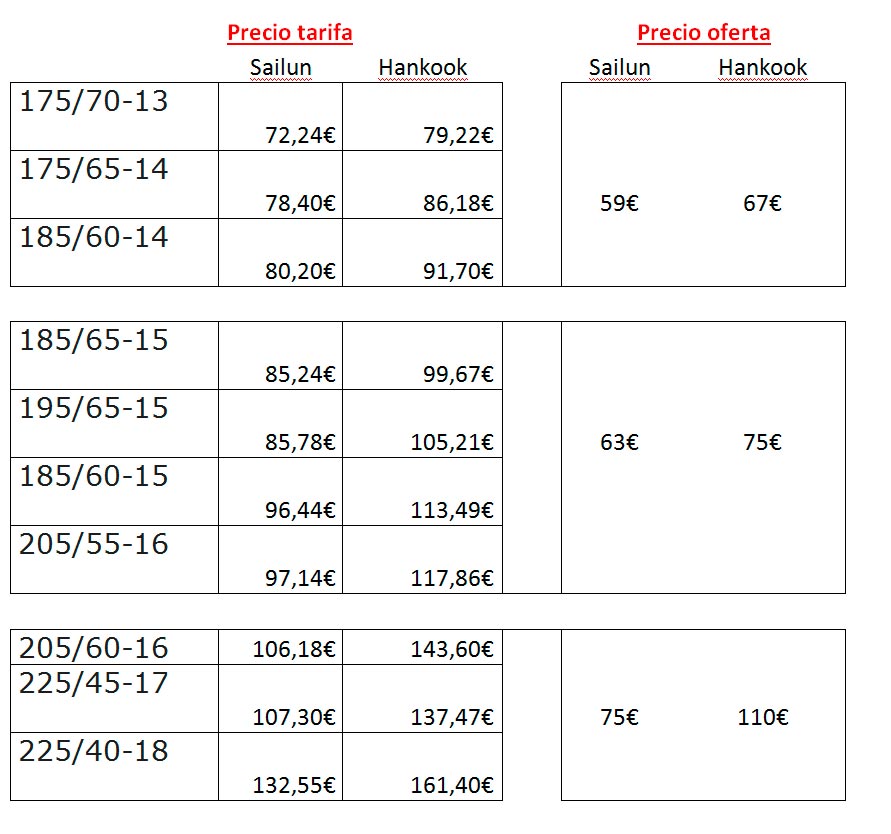 * Neumáticos de alta calidad Hankook (patrocinador del Real Madrid CF y del campeonato alemán de turismos DTM) y Sailun (patrocinador del Valencia CF), ambos entre el top 20 del ranking de los principales fabricantes a nivel mundial.